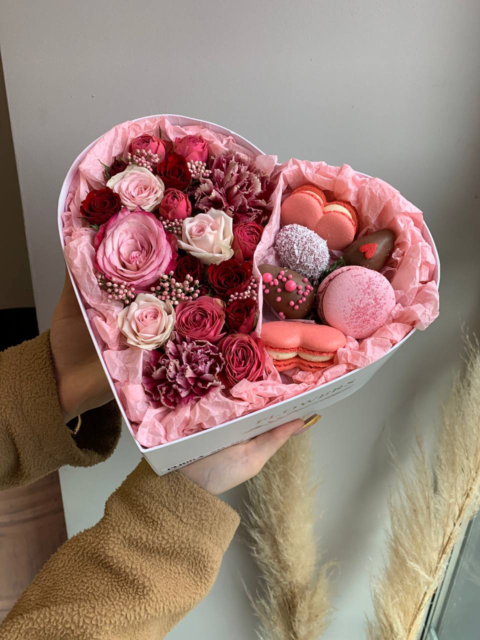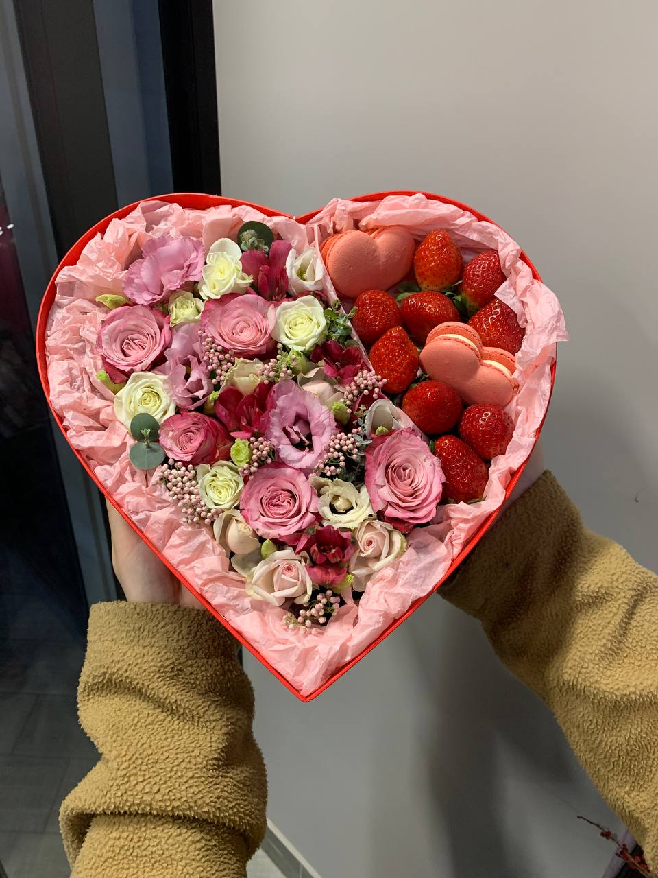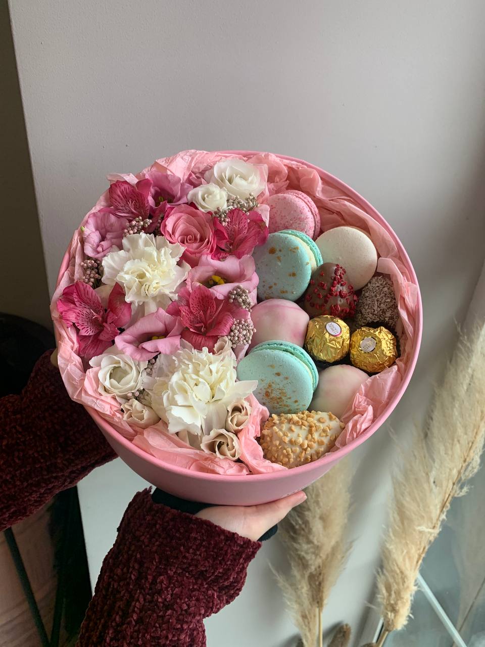 Здесь вы найдете примеры композиций из цветов с различными вкусняшками: конфетами, макаронсами, клубникой в шоколаде и многое другое