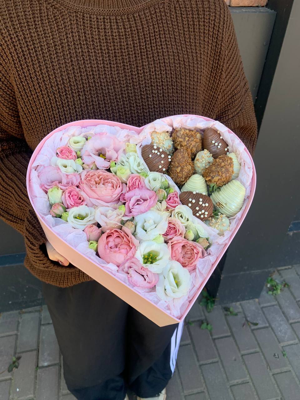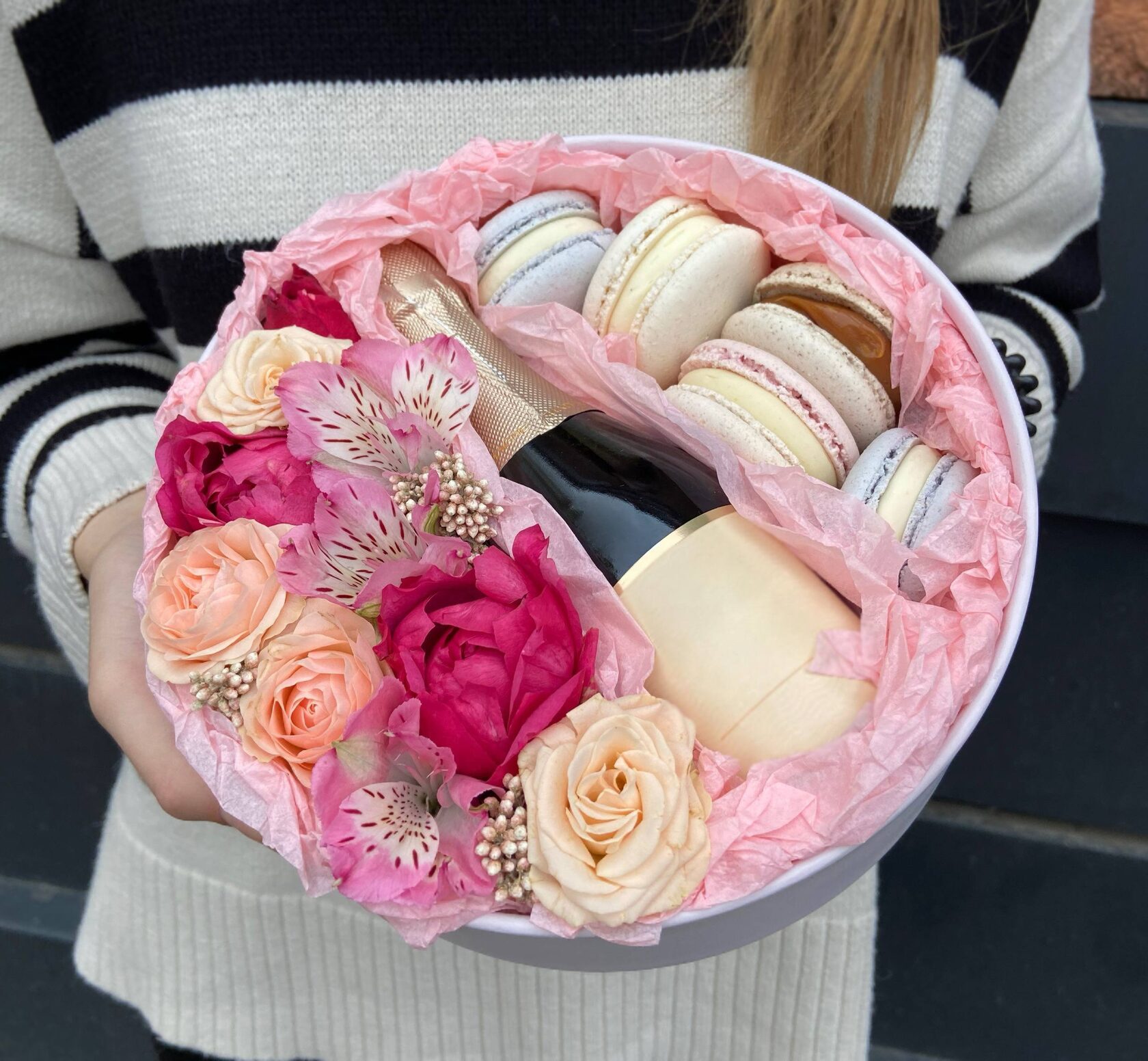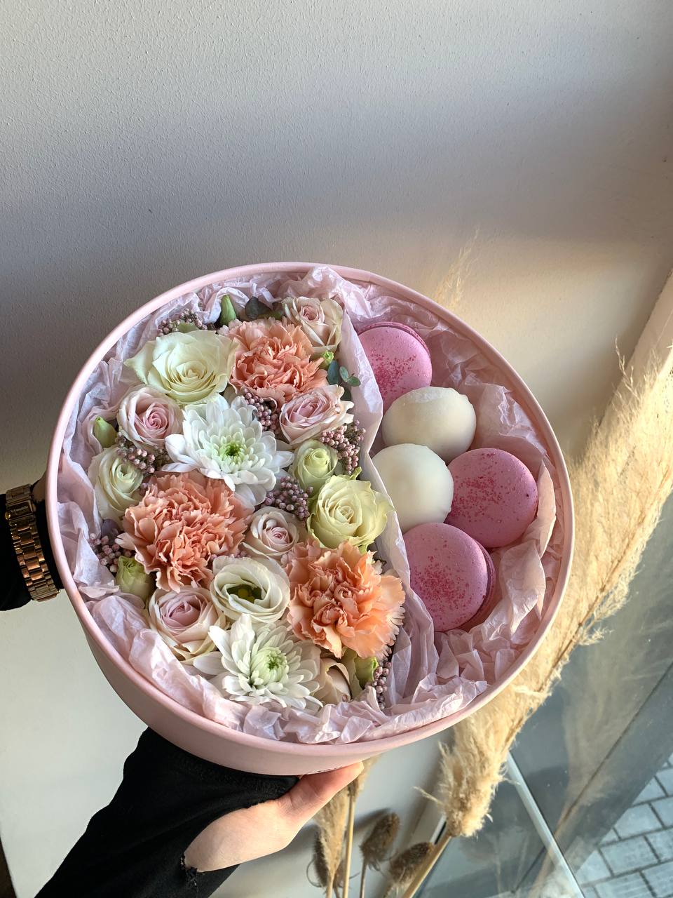 Здесь вы найдете примеры композиций из цветов с различными вкусняшками: конфетами, макаронсами, клубникой в шоколаде и многое другое